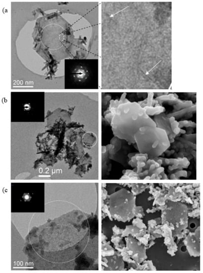 TEM images and SAED patterns were collected for material sampled at regular intervals during the reactions of green rust with solutions C1 and C6 (Figure 6 and Figure 7). Each sample contained hexagonal plates up to 400–500 nm in size and up to 20 nm thick. After 5 s, reaction C1 results in a mixture of particles with hexagonal and rod-like morphologies (Figure 6a). These particles appear to be associated with each other, although no specific boundaries of the type observed by Skovbjerg et al. (2006) are seen. After 1 min of reaction time, when the green rust has been fully oxidized, the product is again dominated by wide hexagonal particles and smaller rod-like particles, which are either separated from the hexagons or located near their edges. SAED patterns for C1 samples after 1 min of aging (Figure 6b) show two sets of diffuse spots arranged hexagonally, corresponding to Bragg diffraction with d-values of ~2.5 and ~1.7 Å. The d-values roughly match the 330 and 300 spacings of green rust (accounting for slight changes in spacing due to differences in the Fe(II) and Fe(III) ionic radii) identified by Christiansen et al. (2009) [41], indicating that aspects of the original structure in the 100 direction has been preserved. Rod-like particles incorporated into the hexagonal particles are also visible in the SEM images. After 7 days of aging, the boundaries of the hexagonal particles have roughened and very faint SAED spots corresponding to the same spacings can be seen (pattern in the inset has been enhanced for visibility). Both the SEM and TEM images indicate that rod-like particles are still incorporated into the structure, and the SEM images of the particles show that they have become thicker and have a rough, amorphous surface (Figure 6c).