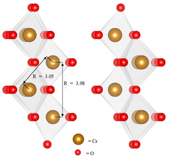 Table 3 shows the calculated parameters of the Cr EXAFs shell fits shown in Figure 5. The coordination numbers of the Cr-O and first Cr-Cr shells are fixed to literature values [38] confirmed during preliminary fits of the region R = 1.2 to 3. The outer shells were fit using pathways calculated from the Cr-substituted lepidocrocite (γ-FeOOH) structure, in which MeO6 octahedra share edges and single corners, corresponding to Cr-Cr distances of 3.05 and 3.98 Å, respectively. The corner-sharing contribution at 3.98 Å has a coordination number between 1.5 and 2.5 in all samples, corresponding to the γ-MeOOH local structure typical of poorly crystalline Cr hydroxides, particularly those on Fe oxide surfaces [39,40].