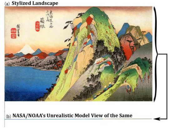 (a) Hiroshige Utagawa’s 1833 ukiyo-e print: “Bandits’ Paradise: Hakone on the Tokaido” (looking towards Mt Fuji), it intuitively and stylistically demonstrates undulations with a patchwork mosaic of landforms and also shows how people closely follow each other, rarely looking out beyond the pack for tribal reasons of safety; (b) NASA/NOAA’s alternate ‘flat-Earth’ view of this landscape; remarkably, most current totals of biodiversity, productivity, plus carbon and other nutrient budgets based upon their flat linear-model are consequently incorrect, widely underestimating true values.