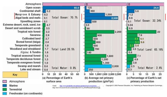 Net primary productivity (NPP) contributions of ‘flat-Earth’ biomes (corrected in yellow); despite contrary claims, mangroves or coral reef (in red) are of minimal importance, just ~2% overall; ditto water. [After [27] (fig. 54.4) from [25] “Stiling (1996), Ecology: Theories and Applications”].