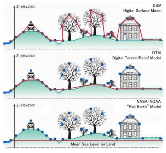 Theoretical terrain DEMs include DSM, a Digital Surface Model representing Earth’s surface including all structures upon it, in contrast to the Digital Terrain Model (DTM) that represents bare ground without any objects like snow, plants or buildings (Figure 6).