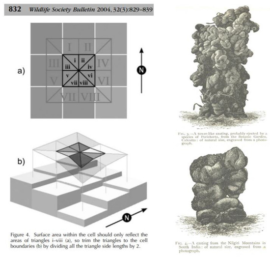 Classical and, perforce, simplistic DEM from Jenness (2004: figs. 4a, b) [47] as compared to impossible complexity of earthworm casts from Darwin (1881: figs. 3, 4) [31]; straight lines are rare in Nature and models need to allow for arc length, regardless if concave or convex. In reality, possibly only laser scanning can accurately record extent and surface areas of natural events and forms. (Note too that worms’ surface castings indicate tunneling and channeling of aerating sub-surface voids).