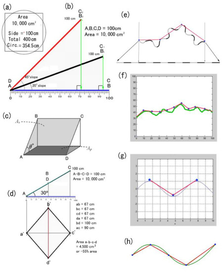 Slope or model concepts: (a) a circle and square of same area; (b) foreshortening on blue base line of a sloped red or black hypotenuse (=diameter of circle or side of a square); (c) basic Ti model of sloped area over actual base area; (d) projection errors for quadrat surveys; (e–h) sinuous or tortuous topography/relief at various scales showing how straight (red) line models invariably miss curve complexity as found in Nature. Respective corrections to quadrats, the stalwarts for ecological surveys, and for DEM arcs are advocated, flagged, and/or newly applied herein (see Appendix A).