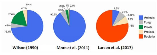 - Larsen, B.B.; Miller, E.C.; Rhodes, M.R.; Wiens, J.J. Inordinate Fondness Multiplied and Redistributed: The Number of Species on Earth and the New Pie of Life. Q. Rev. Biol. 2017, 92, 229–265. [Google Scholar] [CrossRef]