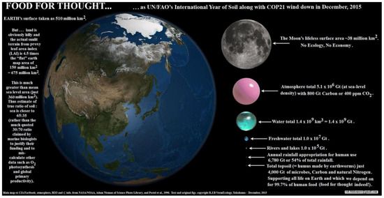 While flat planimetric areas are suitable for administration, they are inapplicable for ecology. Under that worldview, the land seems relatively unimportant when compared to oceans and the current disparity for soil ecology is such that the World Scientists’ Warning to Humanity [12] originally from the majority of science Nobel laureates (most of whom were unqualified to comment since there is yet no prize for Applied Ecology) notes that: “the loss of soil productivity was listed as a concern in the 1992 scientists’ warning, but this variable was not analyzed here due to a lack of global data on changes in soil productivity”. Neither were their issues “ in order of importance or urgency”. Similarly, the UN’s 17 Sustainable Development Goals (from UN 2015 “2030 Agenda”—un.org/sustainabledevelopment/sustainable-development-goals/) overlook soil or earthworms as major considerations, citing “soil” but twice under “Goal 15: Life on Land”.