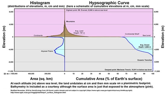 The present study builds on the author’s earlier work [2,7,8,9] and sources that are cited therein. Before focusing on topsoils/earthworms, it is necessary to first consider a broader picture and the implications of increasing land relief. By long-standing convention, land area is measured on a common surface plane projected onto the ground, i.e., as a two dimensional (2-D), flat, planimetric area. NASA/NOAA estimates are of 14.8–15.1 Gha land (29.2%) and 36.2 Gha ocean (70.8%) giving around 51 Gha for Earth’s (flat) surface [10]. However, these totals do not consider terrain, topography, nor rugged surface topsoil relief. In other words, they ignore that the ground is naturally hilly and soil bumpy. Reasoning from these Space, Oceanic, and Atmosphere agencies (everything but Soil?) is along the lines of the Globe being so large that slight elevations, such as the Alps, Andes, Antarctic Ranges, Atlas Mounts, Australia’s Great Dividing Range, Ethiopian Highlands, Himalayas, Japanese Alps and the North American Cordillera are insignificant. This may be essentially true at scales of observation around 10,000 km to 10,000 m (at which Ying et al. 2014 also found topography negligible, as is noted later). Under-appreciated is that while the sea is horizontally flat, land invariably undulates, and, since it indeed occupies only 29% of the projected surface, then the more planar versus hilly parts of just this proportion are inter-comparable. The following table summarizes the current false ‘flat-Earth’ status (Table 1).