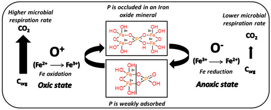 Theory dictates that sorption dynamics of P are regulated in part by soil redox conditions (Figure 1). In tropical forest soils rich in Fe-(hyd)oxides, Fe(III) becomes the dominant terminal electron acceptor when O2 becomes depleted [14], a relatively common occurrence in fine-textured humid tropical forest soils [15,16]. The reductive dissolution of Fe minerals may release sorbed P and decrease P sorption strength, thus increasing the biological availability of P [17,18,19,20]. In turn, when soils become aerated, soluble Fe species are reoxidized. Iron oxidation increases P sorption potential to the soil mineral phase [21], which may decrease P availability to microorganisms. The effects of changing redox conditions on microbial activity in humid tropical soils is often overlooked in relation to soil P dynamics. Anoxic conditions may slow microbial respiration and activity [14,15,22], decreasing the ability of microbes to utilize P or compete with the mineral phase for soluble P. Soil aeration can stimulate microbial activity, and thus may drive an increase in microbial P requirements and assimilation potential [23] (Figure 1).