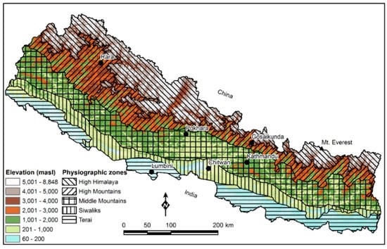 The Terai Plains extend 800 km (East–West) and 30 to 40 km (North–South) with an elevation ranging from 60 to 700 m. The slope of the Siwalik Hills abruptly increases from Terai, and elevations range from 700 to 1500 m. The Middle Mountains act as the first barrier to monsoon rain and their elevation extend from 1500 to 2700 m. The High Mountains are 50 km wide and elevation ranges from 2000 to 4000 m. The snow-covered High Himalayas extend from 4000 to 8848 m elevation [6,21]. It is important to note that the physiographic regions overlap each other for the elevations so the elevation described here is in the range values (Table 1).