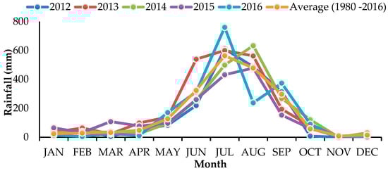 Mean monthly rainfall (mm) in western Nepal for the years 2012–2016 and the average for 1980 to 2016. The rainfall data of 13 stations were retrieved from Department of Hydrology and Meteorology, Nepal (See Table S1).