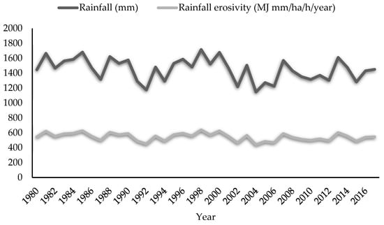 The volume of annual rainfall varied from 1147 to 1716 mm, through the years (Figure 4). Similarly, the rainfall erosivity factor (440–639 MJ mm ha−1 h−1 year−1) calculated from annual rainfall data did not appear to be increasing or decreasing over the same period of time. In contrast, the soil erosion rates have increased; mean rates were 5.35, 5.47 and 6.03 t ha−1 year−1 in 1995, 2007 and 2015, respectively [36]. This may be explained in the context of climate change since the number of rainy days is decreasing but the rainfall volume is not changing. Therefore, the same amount of rain is falling with greater intensity, leading to a worsening erosion problem during the monsoon season.