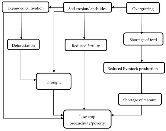 As most of the SOM is located on the topsoil, several researchers have indicated that soils lost by erosion are 1.3 to 5 times richer in SOM than the soils left behind [53]. With the traditional conventional tillage practices, soil loss of 16.6 t ha−1 was estimated in the maize-growing middle hills of Nepal [44], which constitute a corresponding annual loss of 188 kg organic carbon, 18.8 kg nitrogen and 3.8 kg potassium per hectare, respectively. Deforestation, expanded cultivation, and overgrazing are the major factors contributing to increased runoff and soil erosion leading to low productivity and poverty (Figure 5).