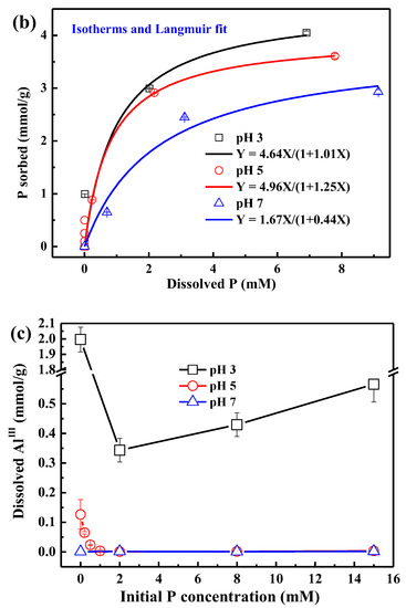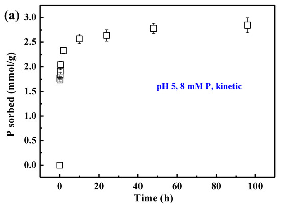 The phosphate exhibits a slowly increasing sorption process after 10 h (Figure 1a), which is probably due to micropore diffusion and/or the formation of precipitates [16,42]. The Qmax at different pHs (Figure 1b) are comparable with the reported values of phosphate sorption on AAH [43,44], but obviously higher than those of phosphate sorption on other Al minerals [17,18,26].