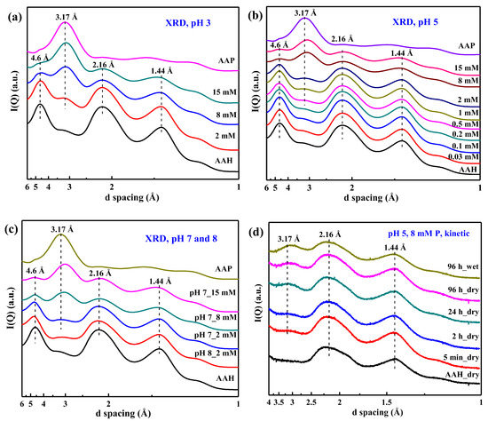 X-ray diffraction (XRD) patterns of the air dried phosphate sorption isotherm samples at pH 3 (a), pH 5 (b), and pH 7 (c), and the selected kinetic samples prepared at pH 5 with 8 mM P (d). AAH and AAP are included as references.
