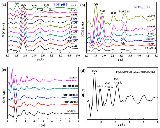 Moreover, the d-PDFs of the phosphate sorption samples prepared at low P loadings or high pH contain a strong peak at ~1.90 Å (Figure 3b and Figure S1d), likely corresponding to the Al–O pair of AlO6. Such a peak also occurs in the differential PDF of PDF-MCR-II minus PDF-MCR-I (Figure 3d). If phosphate only forms binary surface complexes, AlO6 should be absent in the complexes. The presence of this peak suggests that PO4–AlIII ternary surface complexes form besides the binary surface complexes. This peak is more significant for the adsorption sample prepared at pH 5 than at pH 8, consistent with lower pH favoring AAH dissolution, hence the formation of the ternary surface complexes. Similar ternary complexes also occur with phosphate sorption by ferrihydrite [16], but not for sulfate adsorption on ferrihydrite [41].