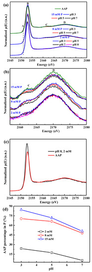 All sorption samples and AAP exhibit a very weak pre-edge feature at ~2151 eV (peak A) (Figure 4a and Figure S1a) [34], and its intensity remains almost constant at different conditions. In contrast, phosphate sorption on ferrihydrite shows a pronounced pre-edge peak, the intensity of which positively correlates with the number of Fe atoms bound to each PO4 [35,36]. With increasing P loading on AAH or decreasing pH, the white-line peak B slightly shifts to a higher energy, and a shoulder peak at ~2162 eV (peak C) gradually appears and grows, increasingly resembling that of AAP. In addition, the pH and initial P concentration both show remarkable effects on the intensity and energy shift of peak C, exhibiting an obvious trend with the change of pH value (Figure 4a,b) and initial P concentration (Figure S2a,b), suggesting that lower pH and higher initial P concentration favor the formation of surface precipitates.