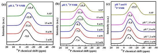 The 31P NMR spectra of phosphate sorption on AAH as a function of P loading at different pH are shown in Figure 5a–c. The unreacted phosphate species has a chemical shift (δP) of +4–+5.5 ppm [37], which decreases after phosphate sorption on AAH. For the sorption samples with a lower P loading or higher pH, a broad peak with δP at −7.4 ppm appears and the δP values are similar with P sorption loading increasing from 0.25 mmol/g (pH 5, 0.5 mM P) (Figure 5b) to 0.52 mmol/g (pH 8, 2 mM P) (Figure 5c). As the P sorption loading continues increasing to 4.05 mmol/g (pH 3, 15 mM P) (Figure 5a), the peak becomes broader, and δP shifts from −7.5 ppm to −12.8 ppm, increasingly close to δP (−15.5 ppm) of AAP, indicating formation of more surface precipitates. The precipitates have more negative δP values than adsorption complexes likely due to the more P–O–Al linkages per PO4 tetrahedron involved in the structure of the precipitates [22]. Additionally, for the 2 mM P systems with different pH values (Figure 5a–c), δP decreases with decreasing pH, suggesting lower pH favors the formation of surface precipitates.