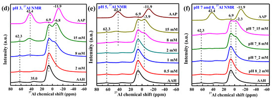 The pristine AAH shows a major peak at δAl = +6.9 ppm and two small peaks at δAl = +35.0 ppm and +62.3 ppm (bottom of Figure 5d–f), respectively, corresponding to AlO6, AlO5, and AlO4 coordination [38]. In contrast, AAP shows two strong peaks at −11.9 and +42.4 ppm, respectively, corresponding to AlO6 octahedra and AlO4 tetrahedra bonded to phosphate [22]. According to the relative peak intensities or peak areas, AAP shows a much higher proportion of AlO4 than AAH. Thus, the formation of surface precipitates from AAH in the presence of phosphate involves the transformation of AlO6 octahedra to AlO4 tetrahedra. The asymmetric peak for the AlO6 in AAH structure is due to a wide distribution of second-order quadrupolar effects [22].