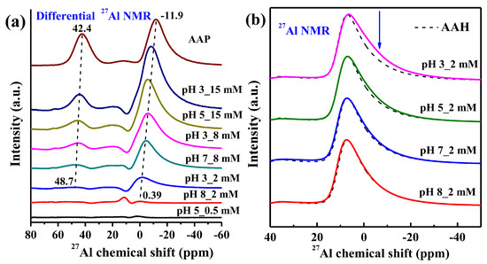 The differential 27Al NMR obtained by subtracting the AAH spectra from the spectra of selected isotherm samples, with gradually increasing P sorption loading from the bottom to the top, by minimizing peak intensity at 6.9 ppm (a), and the 27Al NMR spectra of the 2 mM phosphate sorption at different pHs with the spectra of AAH as the reference (b).