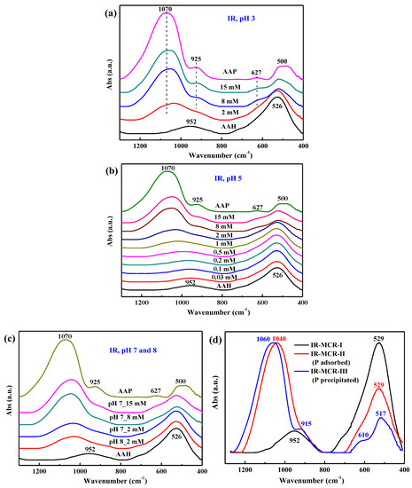 With decreasing pH or increasing initial P loading (Figure 7a–c), the IR spectra of the dried isotherm samples evolve from that of pristine AAH towards spectra increasingly resembling those of AAP. Specifically, the intensities of the P–O stretching bands at ~1070 cm−1, 925 cm−1, and 627 cm−1 of AAP gradually increase, while the intensities of bulk OH deformation bands at 526 cm−1 and 952 cm−1 of AAH become lower. These trends reveal that more surface precipitates formed at lower pH or higher P loading.