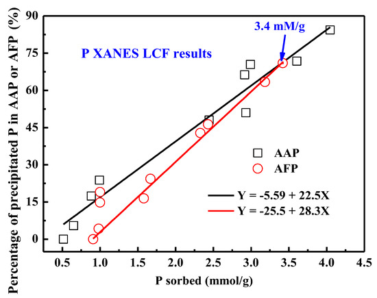 The P precipitation percentage derived from P K-edge XANES LCF analysis, versus the amount of P sorbed (i.e., the total P removed from the solution) on AAH, fitted with linear equation (black line). Similar data for ferrihydrite from a previous study [16] is included for comparison (AFP: amorphous FePO4).