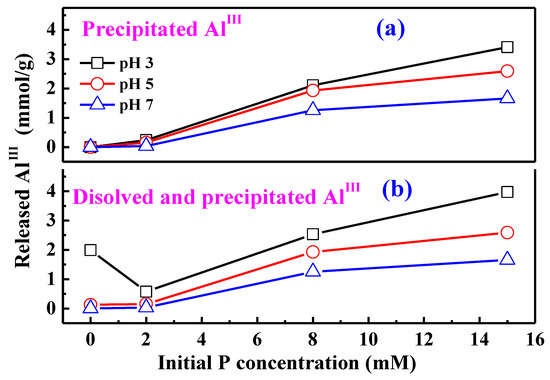 Besides the dissolved AlIII detected in the bulk solution (Figure 1c), a large amount of AlIII released from AAH occurs in the form of surface precipitates analogous to AAP (Figure 9a). Therefore, the total AlIII released from AAH should include both dissolved AlIII in the bulk solution and precipitated AlIII. The released AlIII increases with increasing initial P concentration at both pH 5 and pH 7 (Figure 9b), suggesting that phosphate adsorption promotes the AlIII release. In contrast, the total released AlIII at pH 3 firstly decreases and then increases with increasing initial P concentration (Figure 9b), similar to the variation of dissolved AlIII (Figure 1c). These observations might be related to two processes. On one hand, phosphate surface complexes could block the dissolution of active surface sites [11,47,48,49], thus inhibiting AlIII release at a low P concentration and pH 3. On the other hand, the formation of AAP could consume the released AlIII, promoting further AlIII release at a high P concentration.