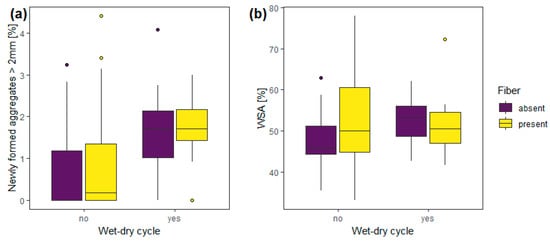 Impact of wet-dry cycles on the effect of polyester microfibers on (a) new formed soil aggregates (in %) and (b) water-stable aggregates (in %). The boxplots represent 25th and 75th percentile, median and outlying points. Presented data were untransformed. Corresponding model statistics can be found in Table 1.