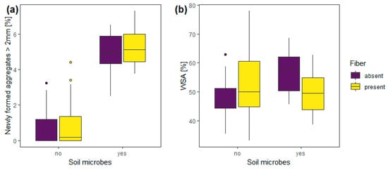 Impact of alive or inactivated soil microbes on the effect of polyester microfibers on (a) new formed soil aggregates (in %) and (b) water-stable aggregates (in %). The boxplots represent 25th and 75th percentile, median and outlying points. Presented data were untransformed. Corresponding model statistics can be found in Table 1.
