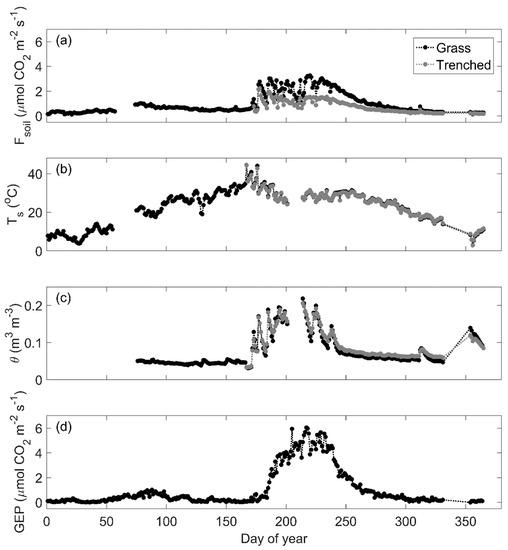 Seasonal pattern in 2017 of observed (a) daily mean soil CO2 efflux (Fsoil), (b) soil temperature (Ts), and (c) volumetric soil moisture (θ) for soil near patches of grass (black) and in bare, trenched intercanopy space (gray) from the grassland. Also shown is (d) daily mean gross ecosystem photosynthesis (GEP).