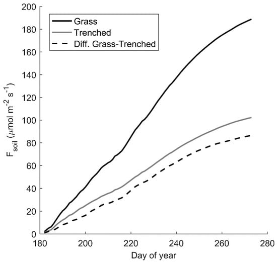 Cumulative daily mean soil CO2 efflux (Fsoil) for grass (black) and bare, trenched intercanopy soil (gray) during the 2017 experiment comparison period at the grassland site. The grass-trenched difference (dashed) is an estimate of belowground autotrophic respiration.