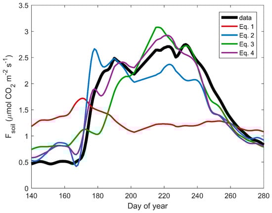 Loess smoothed temporal dynamics in daily mean observed (black) and predicted (color) soil CO2 efflux (Fsoil) at the grassland site. Equation (1) is based on an exponential relationship between Fsoil and soil temperature (Ts), whereas Equations (2) and (3) combine Equation (1) with volumetric soil moisture (θ) and gross ecosystem photosynthesis (GEP) terms, respectively. Equation (4) is the complete model with Ts, θ, and GEP terms.