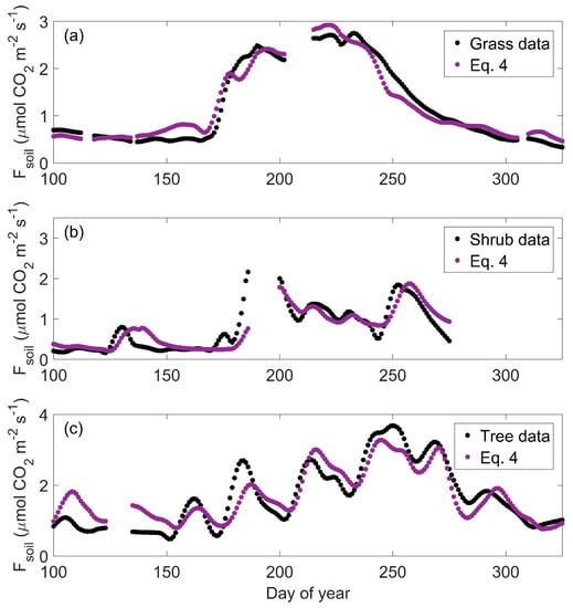 In three semiarid ecosystems we found that Ts, θ, and GEP influenced the dynamics, magnitude, and variability of Fsoil. Water availability strongly influenced Fsoil rates and patterns, whereas GEP stimulated Fsoil, particularly for plots near vegetation. These results provide additional evidence that moisture availability regulates temporal variation in Fsoil, and biological factors impact spatial variation in Fsoil [10,11,13,52]. The complete model (Equation (4)) integrated Ts, θ, and GEP controls and better captured temporal dynamics in observed Fsoil than less complex models. Testing the model across sites with similar climate forcing indicated that the explanatory value of model drivers varied with vegetation structure and productivity. Together, these results show that models that account for Ts, θ, and GEP can represent how Fsoil responds to changes in water availability and vegetation activity in ecosystems with varying structure.
