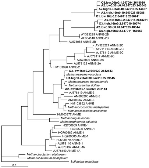 - Orphan, V.J.; House, C.H.; Hinrichs, K.-U.; McKeegan, K.D.; DeLong, E.F. Methane-consuming archaea revealed by directly coupled isotopic and phylogenetic analysis. Science 2001, 293, 484–487. [Google Scholar] [CrossRef] [PubMed]