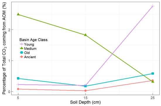 Percentage of total CO2 attributed to AOM by basin age class and soil depth in the pilot experiment. Proportions represent total amount of CO2 from AOM relative to total amount of CO2 evolved over the course of the incubation (all 384 h). There is one incubation represented per age class and depth interaction (n = 12).