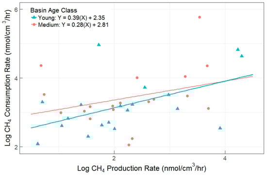 Gross CH4 production versus gross consumption rates (R2 = 0.51, p < 0.001) for young and medium basin age classes. Each data point represents results from a single incubation, with all incubations represented.