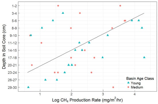 Gross CH4 production rate by soil depth measured in the full experiment. Each data point represents a single incubation. Depth in soil core is oriented along the y-axis with soil surface at top. Also shown is a linear fit line (R2 = 0.22, p = 0.06).