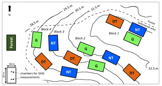 Over the deforested area, three agricultural systems were delimited with a randomized complete block design: Four blocks, i.e., four plots (10 × 20 m), per agricultural system (Figure 2). In the adjacent forest, one plot (10 × 20 m) was also set up as a reference of the native ecosystem’s soil parameters and GHG fluxes (Figure 2).
