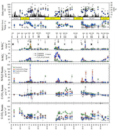 Daily rainfall, soil temperature (0–10 cm), soil gravimetric water content (0–15 cm), ammonium (NH4+) and nitrate (NO3−) contents (0–15 cm), fluxes of N2O, CH4, and CO2 for forest, grassland (G), cropland with disc tillage (DT), and cropland with no-tillage (NT) from May 2011 to November 2014 at the Combi experimental site. In grassland, CO2 emissions included aboveground autotrophic respiration. GC: Regeneration cutting in G plots; GH: Grass harvest in G plots; CoS: Seeding of Crotalaria and Stylosanthes cover; CoC: Cutting of Crotalaria and Stylosanthes (residues were left on the soil surface); MS: Maize seeding; MH: Maize harvest; SS: Soybean seeding; SH: Soybean harvest; Sso: Sorghum seeding; DSo: Chemical destruction of sorghum. N inputs are 50–60 kg ha−1 for each arrow except for croplands on 26 December 2012 (80 kg ha−1) and on 26 December 2013 and 06 January 2014 (75 kg ha−1). P2O5 and K2O inputs for each symbol are 60–80 kg ha−1, except in April and May 2012 (38 kg ha−1). Plain lines are for croplands and dashed lines are for grassland. X corresponds to disc tillage practice in the DT plots. # corresponds to dolomite inputs into all agricultural systems (1 t ha−1, 30% CaO and 20% MgO).