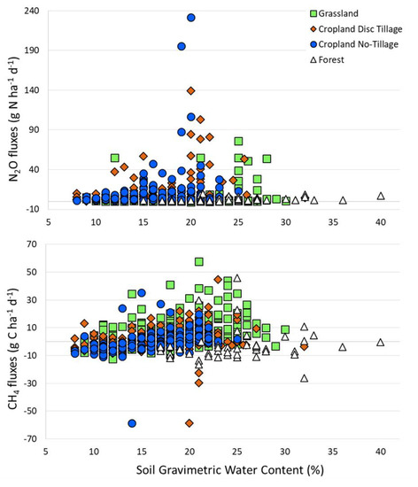 Water-filled pore space is a key factor driving CH4 fluxes from tropical soils (e.g., [13,24,68]). Authors previously observed a shift from CH4 consumption to CH4 emission at around 40% WFPS for pasture soils (Brazilian Amazon) [13] or around 50% for six land management systems, including a high-input cropping system (Peruvian Amazon, loamy soil) [24]. At the Combi site, we found that GWC had a significant effect on CH4 emissions (Table 4). Most of the negative CH4 fluxes from agricultural soils were measured at a GWC ≤ 18% (Figure 5), i.e., WFPS of around 50%, which mainly occurred during the dry seasons.