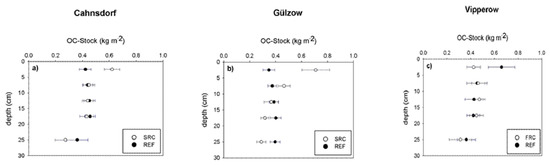 OC-stock in the topsoil (0–30 cm soil depth) of (a) 4-year old (Cahnsdorf); (b) 15-year old (Gülzow) and (c) former (Vipperow) short rotation coppice (SRC), former SRC (FRC) and adjacent reference sites with cereals or manure grasses (REF).