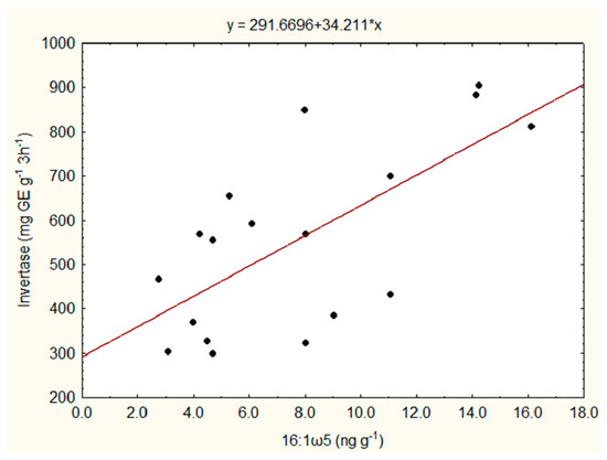 Linear regression between the amount of PLFA 16:1ω5 and the invertase activity in the soil (0–5 cm depth) of test sites with two managements: under short rotation coppice (SRC) or former short rotation coppice (fSRC) and reference sites with cereals or grassland (REF) (three test sites with n = 6 test plots each; 18 plots in total (R2 = 0.46, p < 0.05, n = 18).
