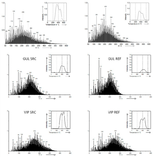 The Py-FI mass spectra of the soil differed strictly in a site-specific manner (see Figure 3 for sites GUL and VIP). Generally, the Py-FI mass spectra were dominated by signals of carbohydrates (m/z 60, 96, 114, 126) and phenols and lignin monomers (m/z 124, 150, 194, 208). Signals of lipids (m/z 256, 392) were generally more intensive at site VIP under both treatments than at site GUL (m/z 256). Furthermore, the signal of a flavonoid (m/z 308) was characteristic for test site VIP in both treatments. The thermograms of total ion intensity (TII) (Figure 3, inserts upper right and Table 4) clearly showed larger ion intensities at site VIP than at site GUL and, at the same site, larger TIIs under SRC and former SRC than under the adjacent REF.