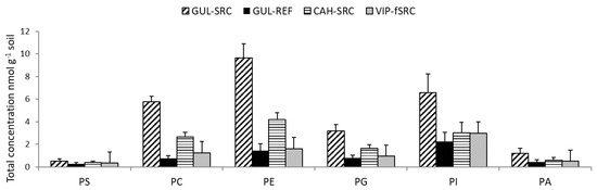 The total content of phospholipids (5.9 to 26.9 nmol g−1) in the soil differed more between SRC and REF at the same site (GUL) than between different sites (CAH and VIP; see Figure 4).