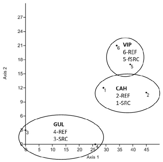 The higher proportion of lignin dimers in the soil under long-term SRC and former SRC soils in the present study might be a consequence of partial degradation of large litter amounts as described by Kalbitz et al. [50] for dissolved organic matter. The increased proportion of both lignin dimers and lipids in the soil also agreed with results from soil under SRC with willows (Salix viminalis) at Swedish test sites [43]. Multivariate detrended correspondence analysis (DCA) separated the present SRC and the former SRC in its SOM quality from the arable REFs. The distance between REF and SRC was shortest for the site VIP with former SRC and largest for the site GUL with long-term and present SRC (Figure 5). Larger precipitation at VIP (see Section 2.1) might have accelerated the alignment of the two different types of land use. Furthermore, the present vegetation at VIP (grass at REF and cereals at fSRC) can be assumed to have very similar litter quality.’