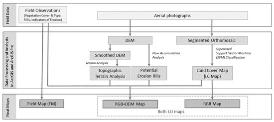 Major improvements to RGB-based and vegetation density-based mapping were able to be achieved when fine-scaled topographic information derived from DEM generated from UAV data was used to identify different landscape units. Therefore, we recommend combining an orthophoto at least with a DEM and a flow accumulation model to gain information on erosion rills and moderately degraded areas.