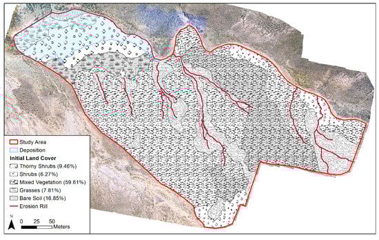 The LC classification (Figure 4B) identified 37.5% (3.64 ha) of the study area as not vegetated (bare soil or stones), 53.9% (5.25 ha) as grasses, and 8.6% (0.83 ha) as shrubs. As the FM and LC map shows, shrubs occur mainly in the northern part of the study area along the main gully and close to the former edges of the reservoir that is now fully silted-up. Additionally, they grow in higher densities alongside or within the bed of larger erosion rills. Differences in grass species, as in the field assessment, were not detected by the LC map. Non-vegetated (bare soil and stone cover) areas show some rills that were also observed on-site.