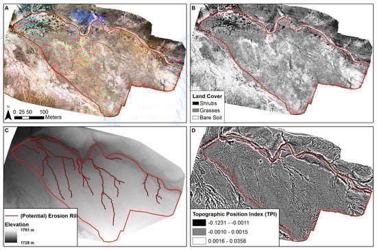 The orthophoto (A) was used for supervised land cover classification (B) (LC map). The DEM (C) was used for flow accumulation analysis to identify potential erosion rills and for the TPI (D) as a basis for landscape unit classification. The study area is marked in red. All maps are at the same scale.