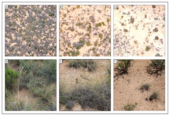 Visual appearance of different landscape units: vegetated (A,D), moderately degraded (B,E), and severely degraded (C,F). The top row (A–CA; B; C; ) shows a 10 × 10 m cutout from the orthophoto used for classification. The bottom row (D–FD; E; F; A; B; C; ) shows typical impressions from the field.