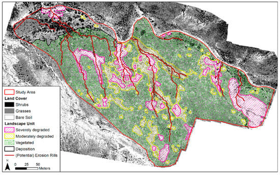 The second map generated from the UAV data is referred to as the Landscape Unit (LU) map because it also contains information on topography. The rationale for distinguishing landscape units is the relationship of soil, soil erosion, and deposition to terrain. Areas of interest were, in particular, bare soil areas with visible erosion features such as rills and areas with exposed shrub roots, since these are indicators of erosion and soil degradation [55]. Vegetation cover greater than 50% was used as an index for healthy soil [42]. A transformation of the Land Cover (LC) raster to a LC density map to assess the percentage of bare soil cover was needed. Therefore, the LC raster was converted to a point dataset, where each raster cell represented a point with its specific land cover (bare soil, shrub or grass). Using a Kernel density function the density of bare soil points in the neighbourhood was. Two bare soil threshold maps were generated from the Kernel density map: (i) bare soil larger than 50% representing moderately degraded areas and (ii) bare soil larger than 70% representing severely degraded areas. Areas smaller than 10 m2 and fully enclosed by an area of different degradation status were appointed to the surrounding area. We assumed that the different classification of these tiny patches was mainly attributed to uncertainties in a distinct LC class allocation of transitional areas and therefore allocated these areas to the surrounding LU. For the final LU maps we used two approaches (Figure 1, Figure 2. For the RGB map, which is based on land cover, the orthophoto (Figure 4A), the LC map (Figure 4B), and the derived bare soil density map were exclusively used. For simplification and because the map is based on a true colour image (the orthophoto), we named it RGB map based on the additive primary colours red, green and blue that are typically used for the display of images in digital cameras. For the RGB+DEM map, LUs were categorized based on visual and elevation differences combining information from the orthophoto, the LC map, the density map, the high-resolution DEM (Figure 4C), and the DEM derivatives, such as slope and flow direction. The extent of the different LUs was then mapped using an overlay analysis in ArcGIS. The depositional area was in both approaches mapped based on field observations and historical aerial imagery that showed the spatial extent of the former reservoir.