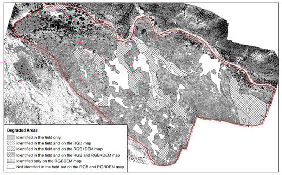 Both methods were able to identify areas of soil degradation. However, their spatial extent differed slightly (Figure 8). Assuming that all bare soil areas of the FM are indicative of soil degradation in the UAV-derived digital RGB map, the extent of degradation mapped in the field was 5% lower than that mapped using UAV imagery. Severely degraded areas could be clearly distinguished from their surrounding by their lower vegetation cover and were identified using both approaches. However, two problems occurred. Firstly, digital mapping based on the orthophoto did not identify areas of soil degradation that had a vegetation cover larger than 50%, such as vegetated erosion rills or rills surrounded by vegetation. This lower percentage of correct identification is attributed to the vegetation cover of the rills, which leaves them partially invisible on the UAV imagery. Secondly, the UAV-based mapping revealed areas of degradation which were not identified in the field. This was probably due to a difficult delineation of cover types in the field due to (i) smooth transitions between increasing/decreasing vegetation cover or type, (ii) the spatial heterogeneity, and (iii) a limited straight down view by the surveyor as opposed to the planform overview from the UAVs’ perspective. Consequently, such visual delineation of LUs in the field depends on their spatial heterogeneity and can be influenced by subjectively introducing a random mapping error, as is mentioned by [23]. In addition, smaller degraded areas that are surrounded by vegetated areas might be invisible from the surveyors’ vantage point and might be missed due to time constraints during field mapping. Degraded areas that were not identified on the FM but during digital mapping are marked in white in Figure 8.