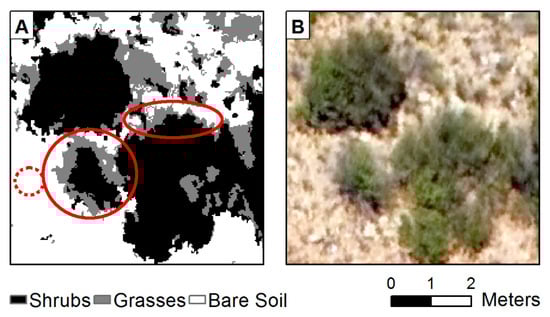 Additionally, heterogeneous landscapes or land cover classes complicate a successful classification, because the landscape is composed of a mosaic of different land covers, such as shrubs, grasses, and bare soil that do not always show distinct boundaries [63]. The moderate overall accuracy of 78%, resulting in an inaccuracy of 22%, can be largely attributed to misclassified vegetation. Grass had the lowest producer’s accuracy (Table 2) with two thirds of the accuracy assessment points incorrectly assigned to shrubs or bare soil. Taking a closer look at the misclassified pixels and aligning them with the field observations revealed that the edges of bushes were often misclassified as grasses (Figure 10). Additionally, misclassified shrub pixels were often accounted as Dicerothamnus rhinocerotis. This shrub has a dull greyish green color which was often incorrectly classified as grass. Grasses, which cover a variety of different shades of green, including very low brightness, were also misinterpreted as shrubs or bare soil (Figure 10). Using a density map to identify healthy landscape areas with a vegetation cover larger 50%, revealed many lower vegetated patches smaller 20 m2 that were not detected during the field mapping. These patches could be the first indicator of arising degraded areas. However, their extent should be treated with caution due to uncertainties in boundary regions.